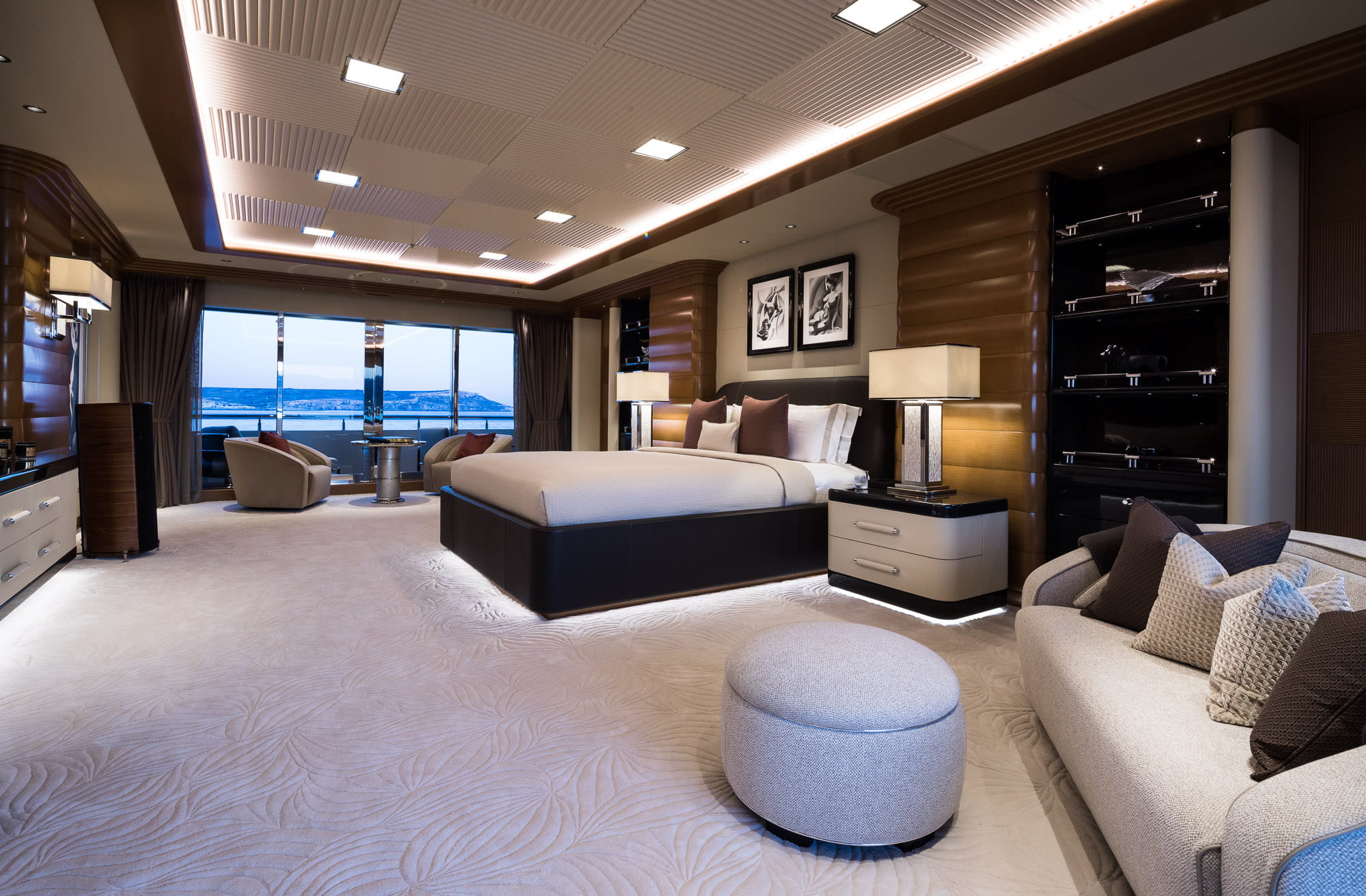 Her 107-metres can accommodate up to 16 guests across eight state rooms, each decorated in calming shades of cream, white and brown, with unique art pieces in each space. Each cabin benefits from generous proportions and unusually large windows, reinforcing the sensation of openness. The owner’s suite, located on the upper deck, stretches the full 14.4-metre beam. Functioning as a private apartment complete with an office and expansive ensuite bathroom, the suite features full-length windows and a private owner’s balcony. It is a space designed to be comfortable and welcoming for extended stays.